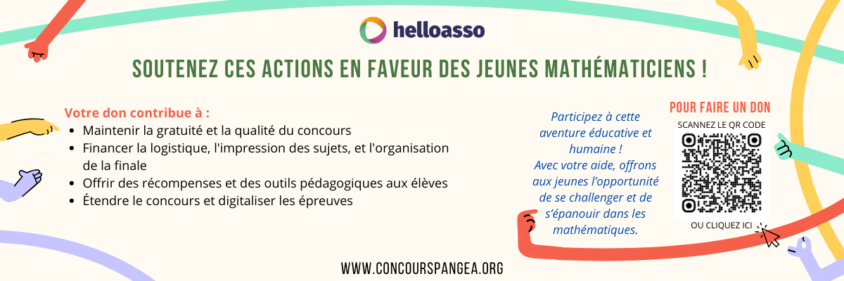 Grâce à votre don, vous contribuez à maintenir la gratuité du concours, à améliorer sa qualité et à inspirer une nouvelle génération de mathématiciens. Rejoignez cette aventure éducative et humaine dès aujourd’hui !